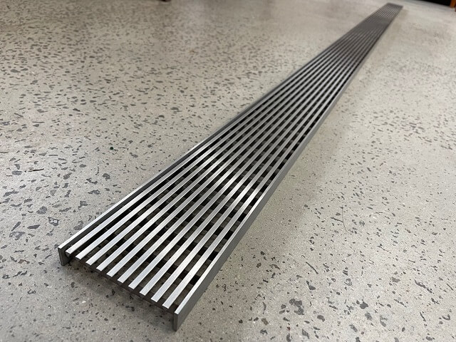 Sleek brushed stainless steel wedge wire grates provide a modern architectural look. Perfect architectural installation for premium landscape drainage or pool drainage