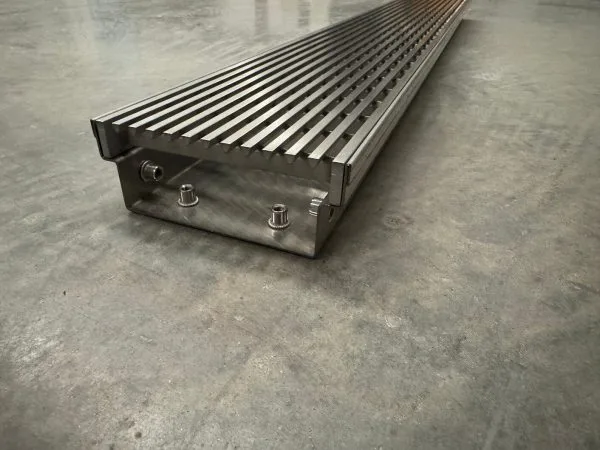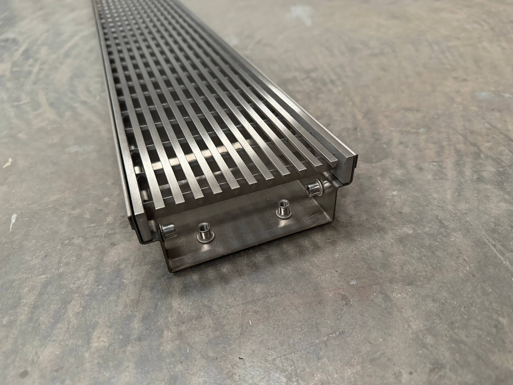 Sleek brushed stainless steel wedge wire grates provide a modern architectural look. Perfect architectural installation for premium landscape drainage or pool drainage