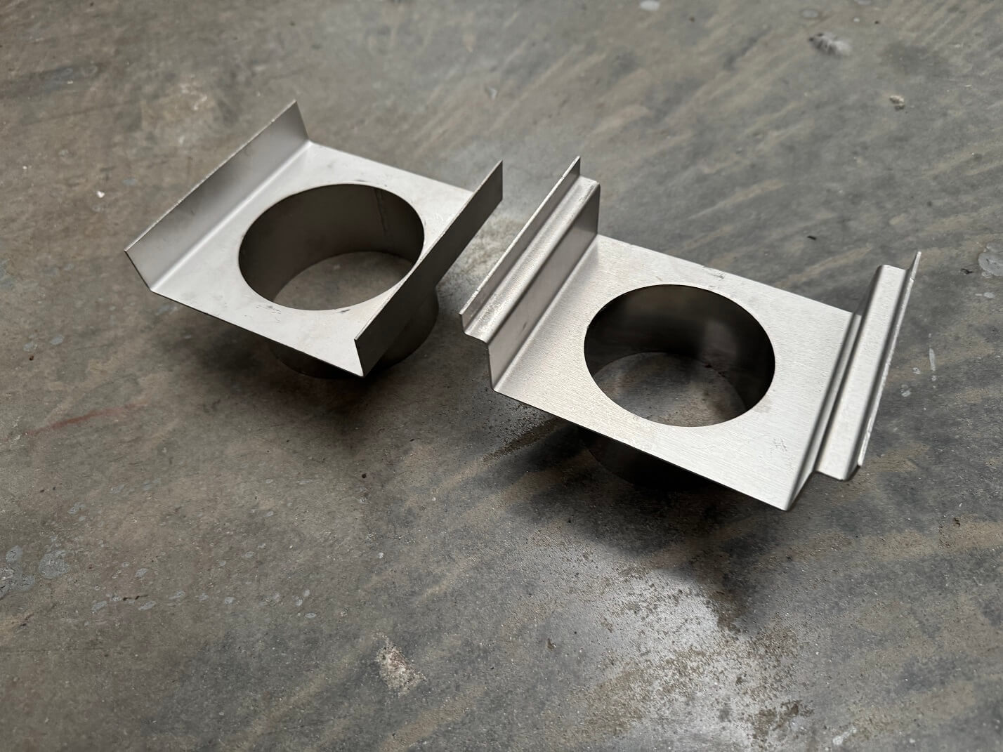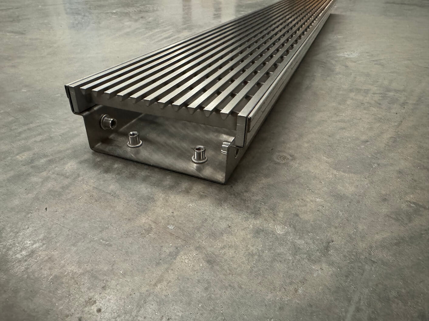 Channel Size:  135 mm wide. 50 mm deep, 1.2 mm thick stainless steel