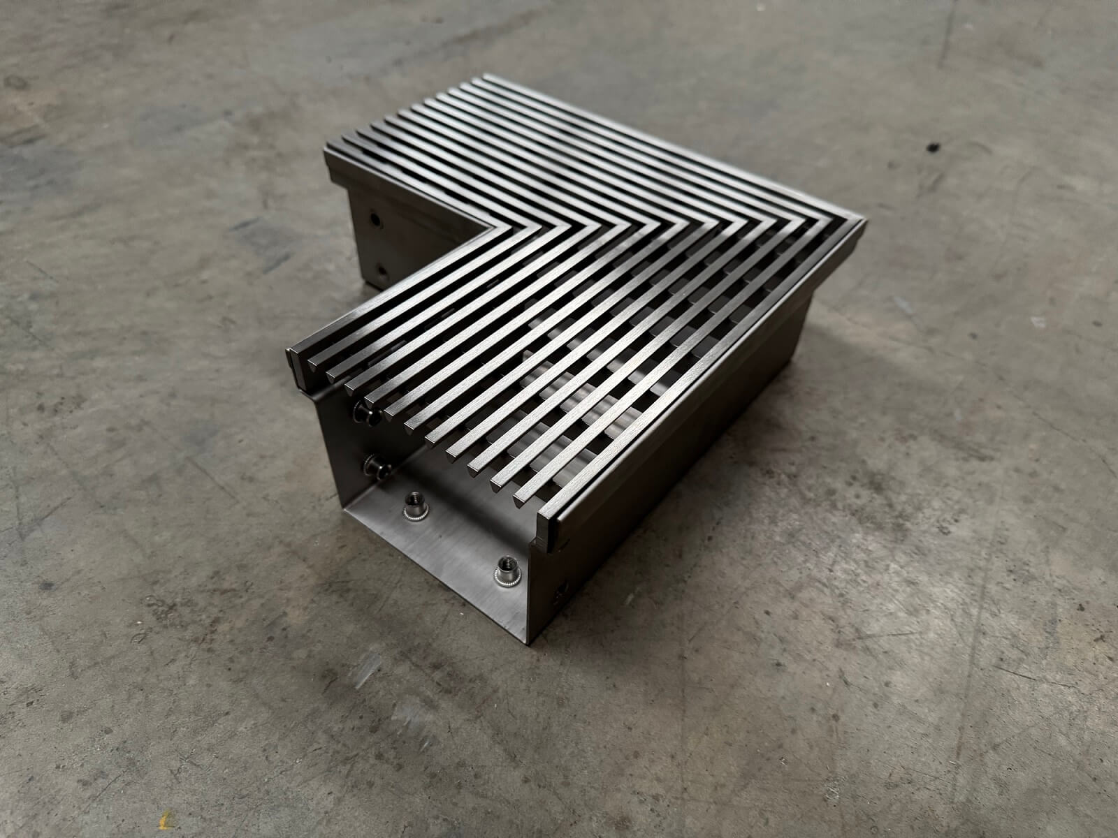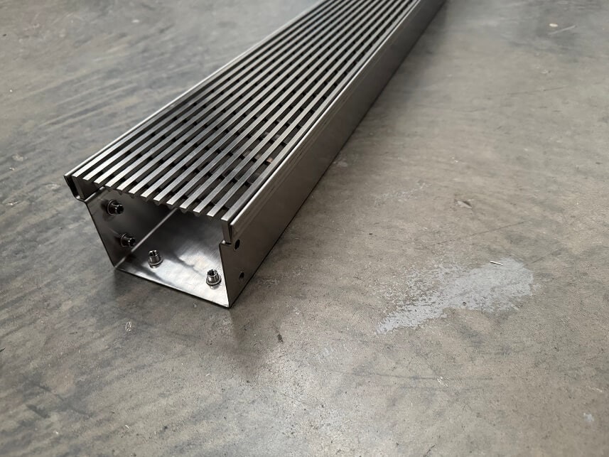 Sleek brushed stainless steel wedge wire grates provide a modern architectural look. Perfect architectural installation for premium landscape drainage or pool drainage