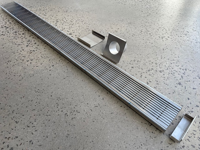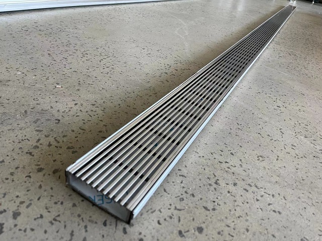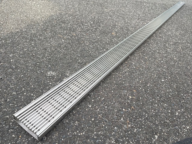 Sleek brushed stainless steel wedge wire grates provide a modern architectural look. Perfect architectural installation for premium landscape drainage or pool drainage