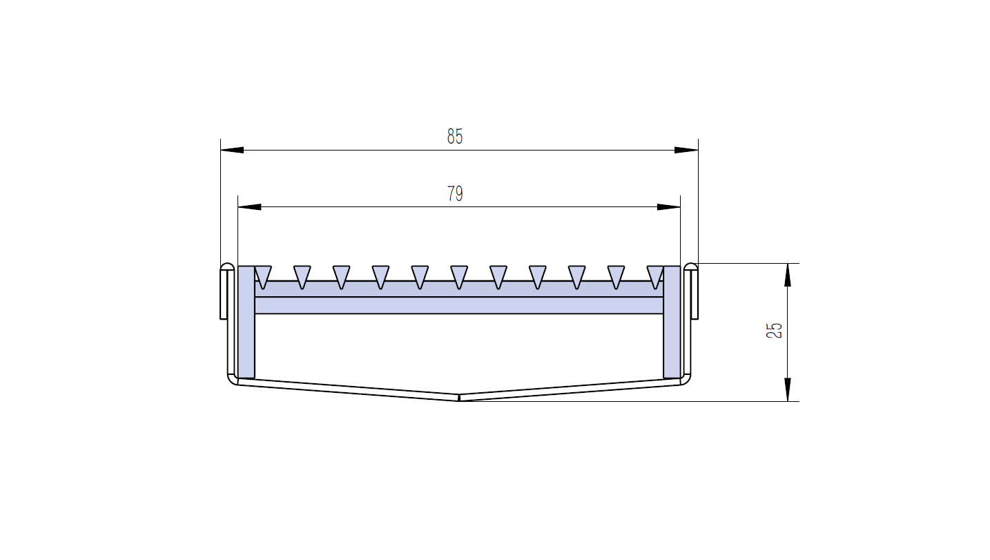 Channel Size: 85 mm wide. 25 mm deep, 1.2 mm thick stainless steel