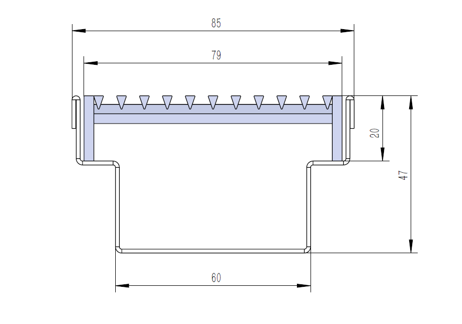 Channel Size: 85 mm wide. 47 mm deep, 1.2 mm thick stainless steel